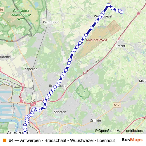 See why over 2 million users trust and consider busmaps.com as the best public transport website. busmaps gives you Brasschaat Buses suggested routes, real-time bus tracker, line route maps in Brasschaat, and helps to find the closest 64 bus stops near you. No internet available? Download an offline PDF map and bus schedule for the 64 bus to take on your trip.