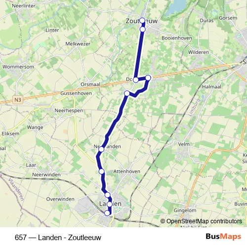 The first stop of the 657 bus route is Zoutleeuw Kerk and the last stop is Landen Station perron 4. 657 (Landen - Zoutleeuw) is operational during on weekdays.