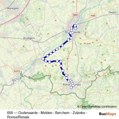 The first stop of the 658 bus route is Oudenaarde Sportcentrum and the last stop is Ronse Station perron 5. 658 (Oudenaarde - Melden - Berchem - Zulzeke - Ronse/Renaix) is operational during on weekdays.