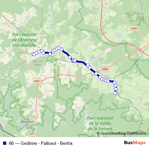 The first stop of the 66 bus route is Paliseul Gare and the last stop is Bertrix Clairière. 66 (Gedinne - Paliseul - Bertrix) is operational during on weekdays.