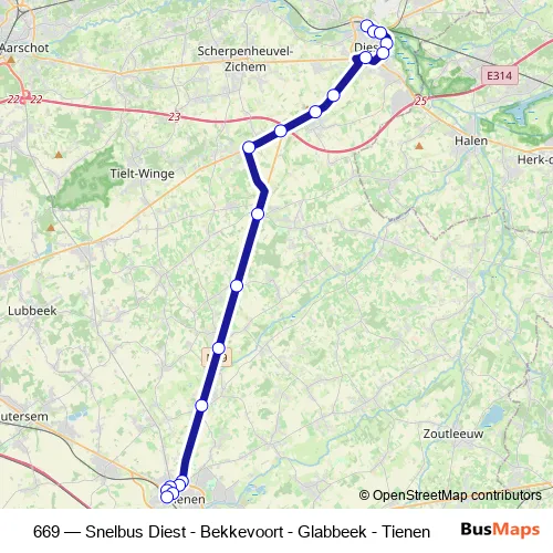 The first stop of the 669 bus route is Tienen Station perron 6 and the last stop is Diest Station perron 3. 669 (Snelbus Diest - Bekkevoort - Glabbeek - Tienen) is operational during on weekdays.