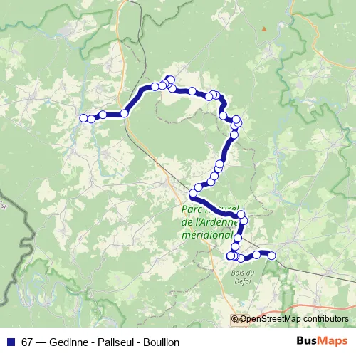 The first stop of the 67 bus route is Paliseul Gare and the last stop is Gedinne Centre. 67 (Gedinne - Paliseul - Bouillon) is operational during on weekdays.