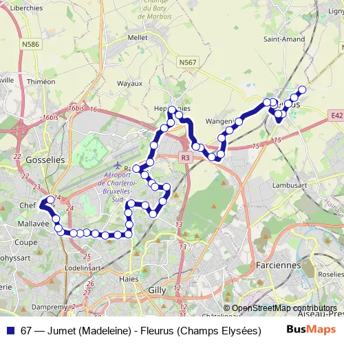 Bus 67 - Jumet (Madeleine) - Fleurus (Champs Elysées) in Ransart: Stops & Timetable