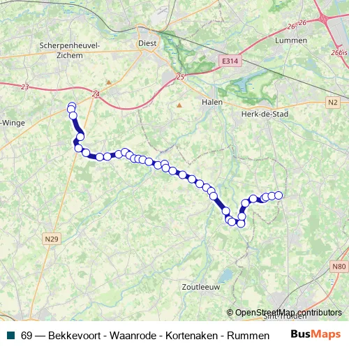 The first stop of the 69 bus route is Bekkevoort Centrum and the last stop is Rummen Weg naar Dorp. 69 (Bekkevoort - Waanrode - Kortenaken - Rummen) is operational during everyday.