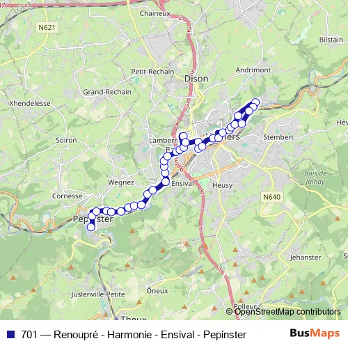 The first stop of the 701 bus route is Pepinster Athénée and the last stop is Verviers Rue de la Cité. 701 (Renoupré - Harmonie - Ensival - Pepinster) is operational during everyday.