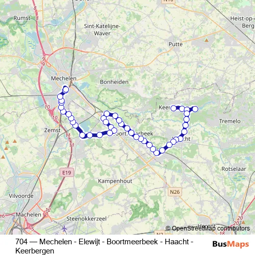 The first stop of the 704 bus route is Keerbergen Atheneum and the last stop is Mechelen Station perron 14. 704 (Mechelen - Elewijt - Boortmeerbeek - Haacht - Keerbergen) is operational during on weekdays.