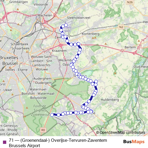 The first stop of the 71 bus route is Zaventem Brussels Airport perron A and the last stop is Groenendaal Station. 71 ((Groenendaal-) Overijse-Tervuren-Zaventem Brussels Airport) is operational during everyday.
