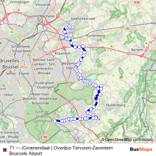 The first stop of the 71 bus route is Zaventem Brussels Airport perron A and the last stop is Groenendaal Station. 71 ((Groenendaal-) Overijse-Tervuren-Zaventem Brussels Airport) is operational during everyday.