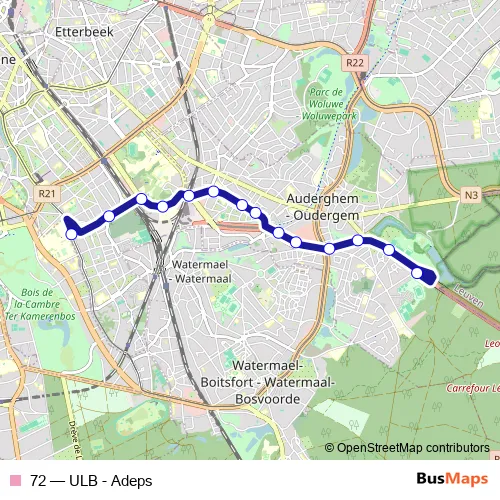 The first stop of the 72 bus route is Adeps and the last stop is Ulb. 72 (ULB - Adeps) is operational during everyday.
