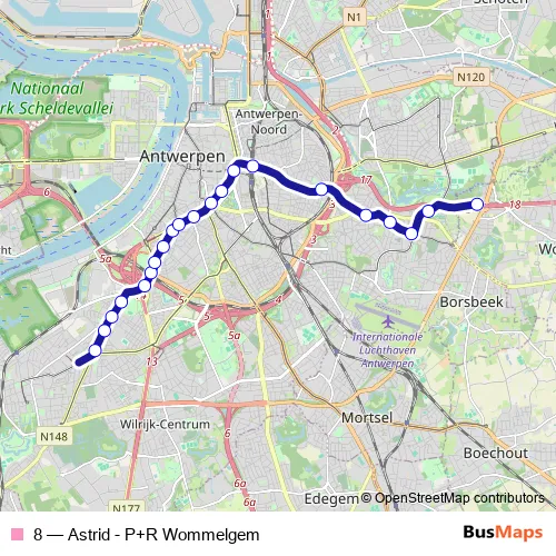 The first stop of the 8 tram route is Hoboken Zwaantjes and the last stop is Wommelgem P+R Wommelgem. 8 (Astrid - P+R Wommelgem) is operational during everyday.