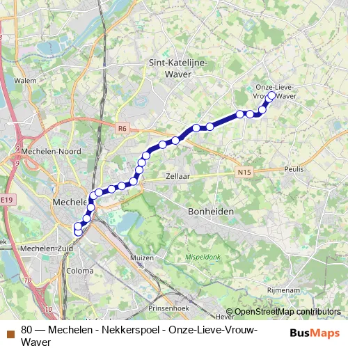 The first stop of the 80 bus route is Mechelen Station perron 19 and the last stop is Onze-Lieve-Vrouw-Waver De Wissel. 80 (Mechelen - Nekkerspoel - Onze-Lieve-Vrouw-Waver) is operational during everyday.