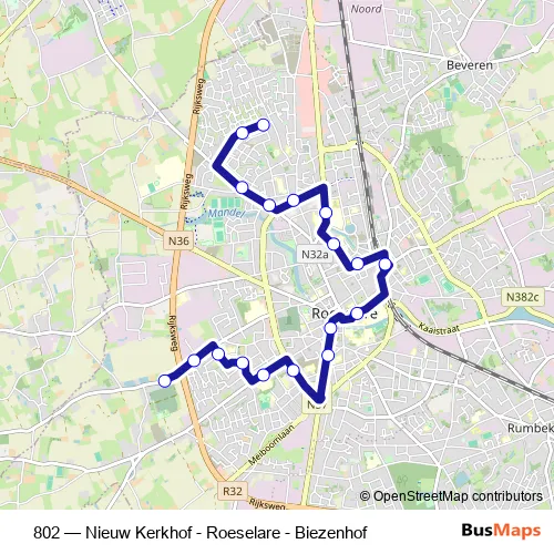The first stop of the 802 bus route is Roeselare Nieuw Kerkhof and the last stop is Roeselare Fazantendreef. 802 (Nieuw Kerkhof - Roeselare - Biezenhof) is operational during everyday.