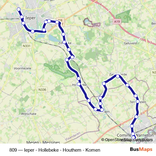 The first stop of the 809 bus route is Ieper Hoekje and the last stop is Komen Sint-Annaplein. 809 (Ieper - Hollebeke - Houthem - Komen) is operational during on weekdays.