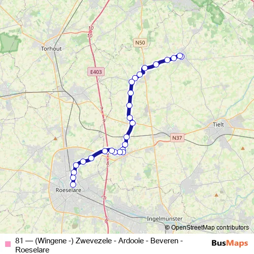 The first stop of the 81 bus route is Zwevezele Hille and the last stop is Roeselare Station perron 6. 81 ((Wingene -) Zwevezele - Ardooie - Beveren - Roeselare) is operational during everyday.