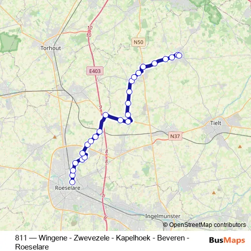 The first stop of the 811 bus route is Roeselare Station perron 6 and the last stop is Wingene Dorp. 811 (Wingene - Zwevezele - Kapelhoek - Beveren - Roeselare) is operational during on weekdays.