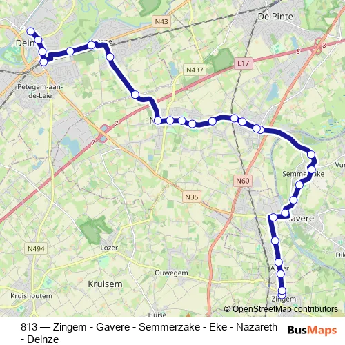 The first stop of the 813 bus route is Zingem Dorp and the last stop is Deinze Kerkhof. 813 (Zingem - Gavere - Semmerzake - Eke - Nazareth - Deinze) is operational during on weekdays.