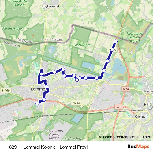 The first stop of the 829 bus route is Lommel Provil and the last stop is Kolonie Grens. 829 (Lommel Kolonie - Lommel Provil) is operational during on weekdays.