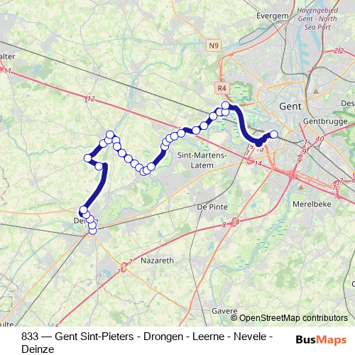 The first stop of the 833 bus route is Deinze Station perron 2 and the last stop is Gent Sint-Pietersstation perron 14. 833 (Gent Sint-Pieters - Drongen - Leerne - Nevele - Deinze) is operational during on weekdays.