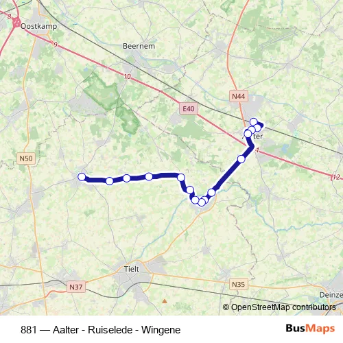 The first stop of the 881 bus route is Aalter Station perron 2 and the last stop is Wingene Dorp. 881 (Aalter - Ruiselede - Wingene) is operational during on weekdays.