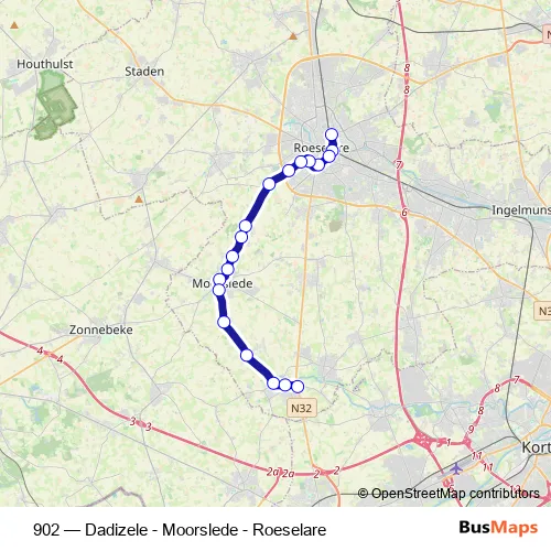 Bus 902 - Dadizele - Moorslede - Roeselare in Moorslede: Stops & Timetable