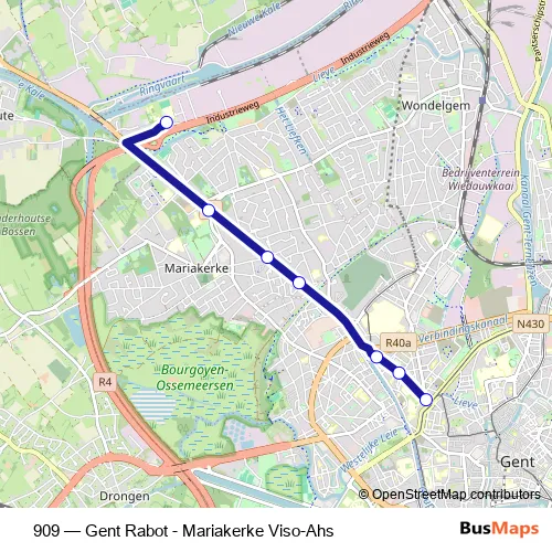 The first stop of the 909 bus route is Mariakerke Viso Ahs and the last stop is Gent Rabot (Griendeplein). 909 (Gent Rabot - Mariakerke Viso-Ahs) is operational during on weekdays.