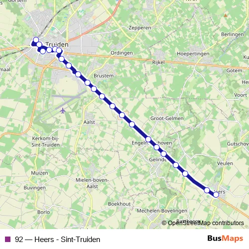 The first stop of the 92 bus route is Sint-Truiden Station perron 6 and the last stop is Heers Weg naar Waremme. 92 (Heers - Sint-Truiden) is operational during everyday.