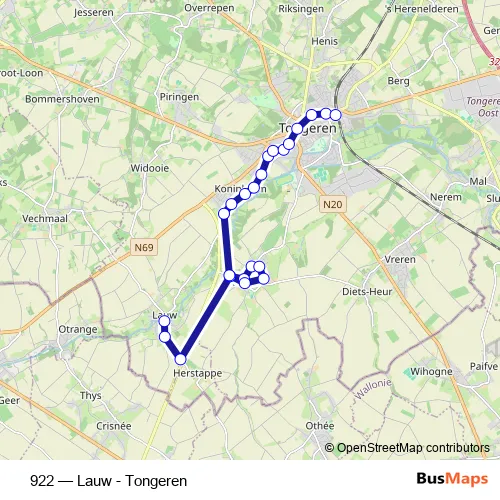 The first stop of the 922 bus route is Lauw, Brug and the last stop is Tongeren, Station. 922 (Lauw - Tongeren) is operational during everyday.