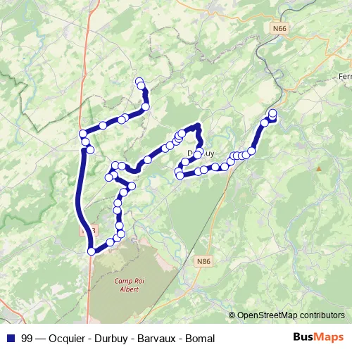 The first stop of the 99 bus route is Ocquier Eglise and the last stop is Bomal Ecole Communale. 99 (Ocquier - Durbuy - Barvaux - Bomal) is operational during on weekdays.