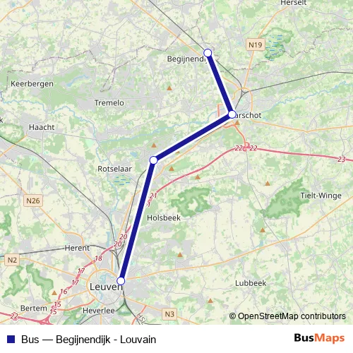 The first stop of the Bus bus route is Begijnendijk and the last stop is Louvain / Leuven. Bus (Begijnendijk - Louvain) is operational during on weekdays.