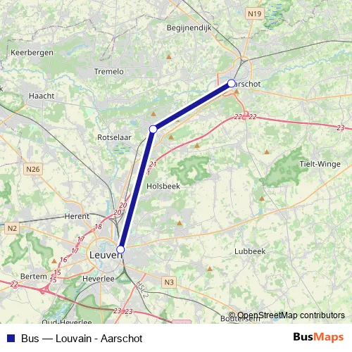 The first stop of the Bus bus route is Aarschot and the last stop is Louvain / Leuven. Bus (Louvain - Aarschot) is operational during everyday.