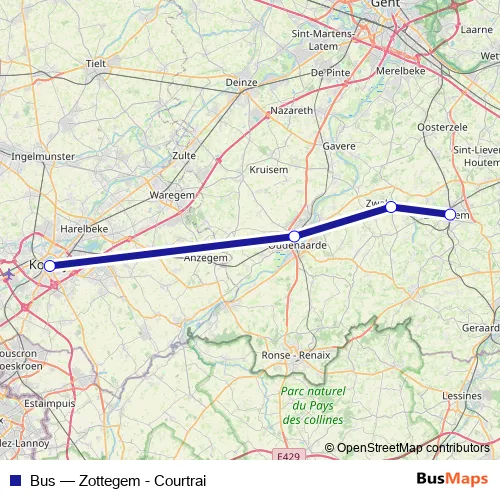 The first stop of the Bus bus route is Zottegem and the last stop is Courtrai / Kortrijk. Bus (Zottegem - Courtrai) is operational during on weekends.