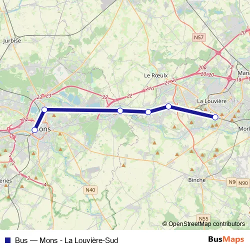 The first stop of the Bus bus route is Mons / Bergen and the last stop is La Louvière-Sud / La Louvière-Zuid. Bus (Mons - La Louvière-Sud) is operational during everyday.