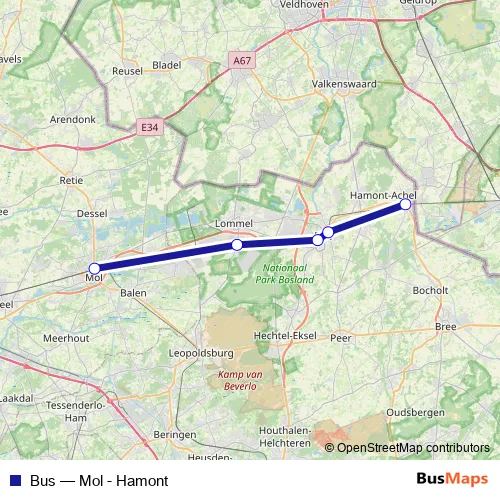 The first stop of the Bus bus route is Mol and the last stop is Hamont. Bus (Mol - Hamont) is operational during on weekends.