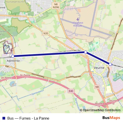 The first stop of the Bus bus route is La Panne / De Panne and the last stop is Furnes / Veurne. Bus (Furnes - La Panne) is operational during on weekends.