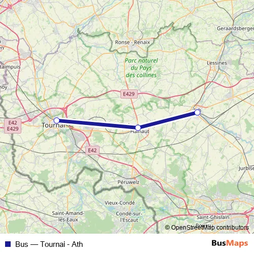 The first stop of the Bus bus route is Ath / Aat and the last stop is Tournai / Doornik. Bus (Tournai - Ath) is operational during everyday.