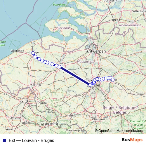 The first stop of the Ext rail route is Bruges / Brugge and the last stop is Louvain / Leuven. Ext (Louvain - Bruges) is operational during on weekends.