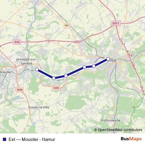 The first stop of the Ext rail route is Moustier and the last stop is Namur / Namen. Ext (Moustier - Namur) is operational during everyday.