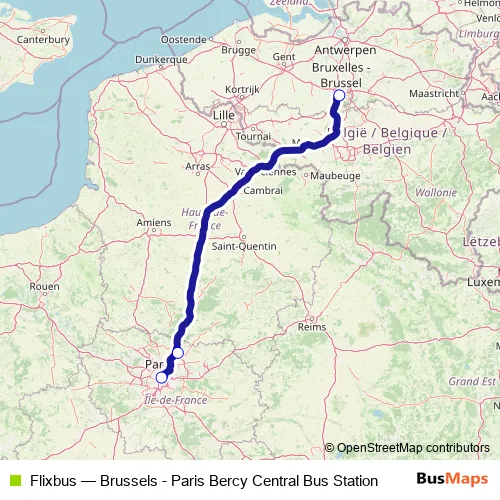 The first stop of the Flixbus bus route is Paris Gare de Bercy Seine and the last stop is Brussels Midi / Brussels South West. Flixbus (Brussels - Paris Bercy Central Bus Station) is operational during everyday.