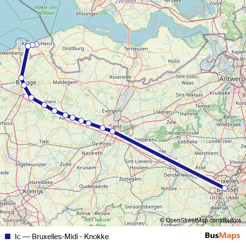 The first stop of the Ic rail route is Knokke and the last stop is Brux.-Midi/Brus.-Zuid. Ic (Bruxelles-Midi - Knokke) is operational during on weekends.