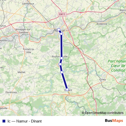 The first stop of the Ic rail route is Dinant and the last stop is Namur / Namen. Ic (Namur - Dinant) is operational during everyday.