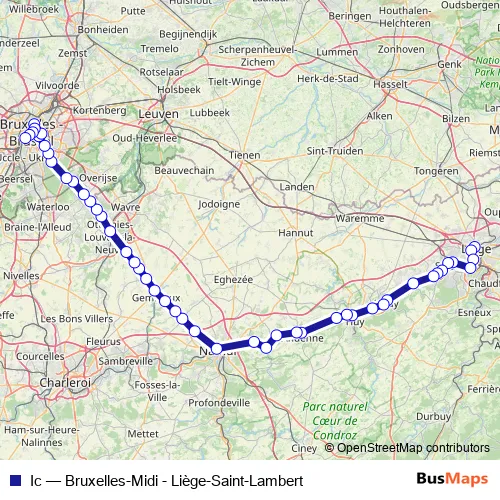 The first stop of the Ic rail route is Liège-Saint-Lambert / Luik-Sint-Lambertus and the last stop is Brux.-Midi/Brus.-Zuid. Ic (Bruxelles-Midi - Liège-Saint-Lambert) is operational during on weekdays.