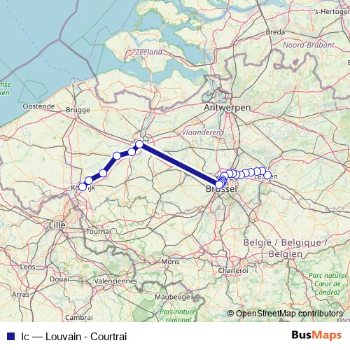 The first stop of the Ic rail route is Louvain / Leuven and the last stop is Courtrai / Kortrijk. Ic (Louvain - Courtrai) is operational during on weekdays.