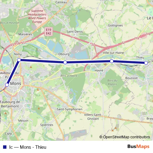 The first stop of the Ic rail route is Thieu and the last stop is Mons / Bergen. Ic (Mons - Thieu) is operational during everyday.