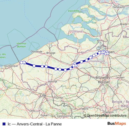 The first stop of the Ic rail route is Anvers-Central / Antwerpen-Centraal and the last stop is La Panne / De Panne. Ic (Anvers-Central - La Panne) is operational during on weekdays.