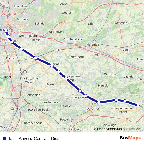 The first stop of the Ic rail route is Anvers-Central / Antwerpen-Centraal and the last stop is Diest. Ic (Anvers-Central - Diest) is operational during everyday.