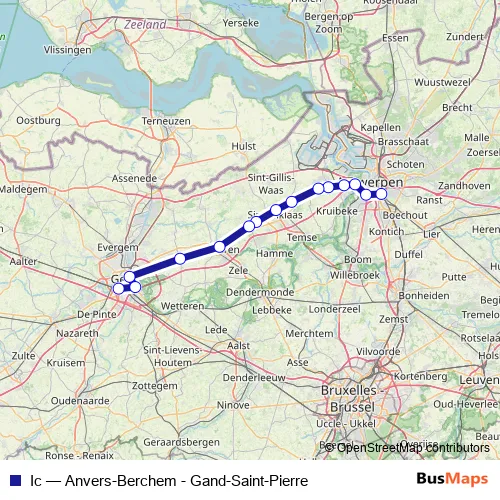 The first stop of the Ic rail route is Anvers-Berchem / Antwerpen-Berchem and the last stop is Gand-Saint-Pierre / Gent-Sint-Pieters. Ic (Anvers-Berchem - Gand-Saint-Pierre) is operational during on weekdays.