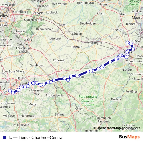 The first stop of the Ic rail route is Liers and the last stop is Charleroi-Central. Ic (Liers - Charleroi-Central) is operational during on weekends.