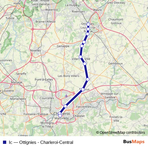 The first stop of the Ic rail route is Ottignies and the last stop is Charleroi-Central. Ic (Ottignies - Charleroi-Central) is operational during everyday.
