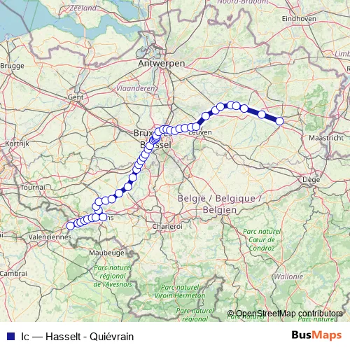 The first stop of the Ic rail route is Quiévrain and the last stop is Hasselt. Ic (Hasselt - Quiévrain) is operational during on weekdays.