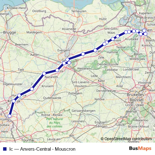The first stop of the Ic rail route is Anvers-Central / Antwerpen-Centraal and the last stop is Mouscron / Moeskroen. Ic (Anvers-Central - Mouscron) is operational during everyday.
